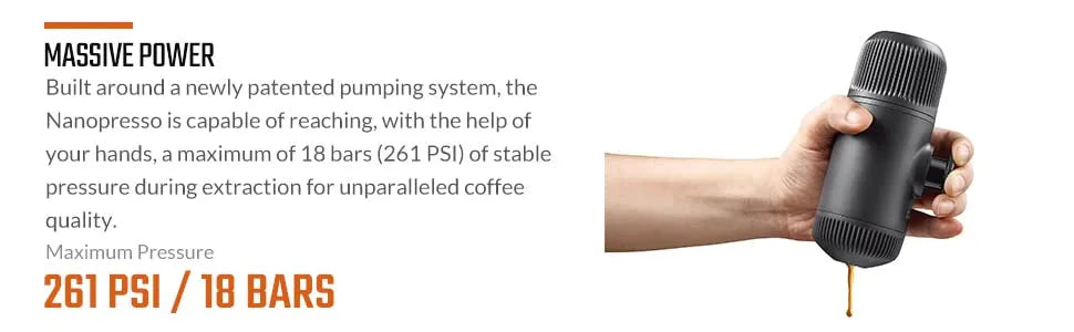 Super Pumping System: Built around a newly patented pumping system and no battery/electric need, the Nanopresso is powerful. With the help of your hands, a maximum of 18 bars (261 psi) of stable pressure is created during extraction for unparalleled Espresso, more than what most home espresso machines can deliver